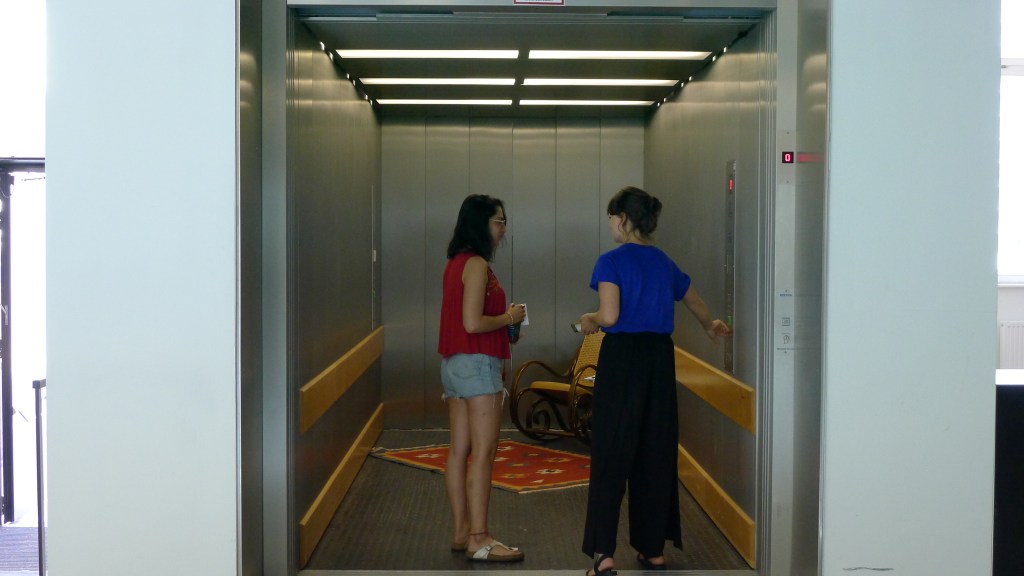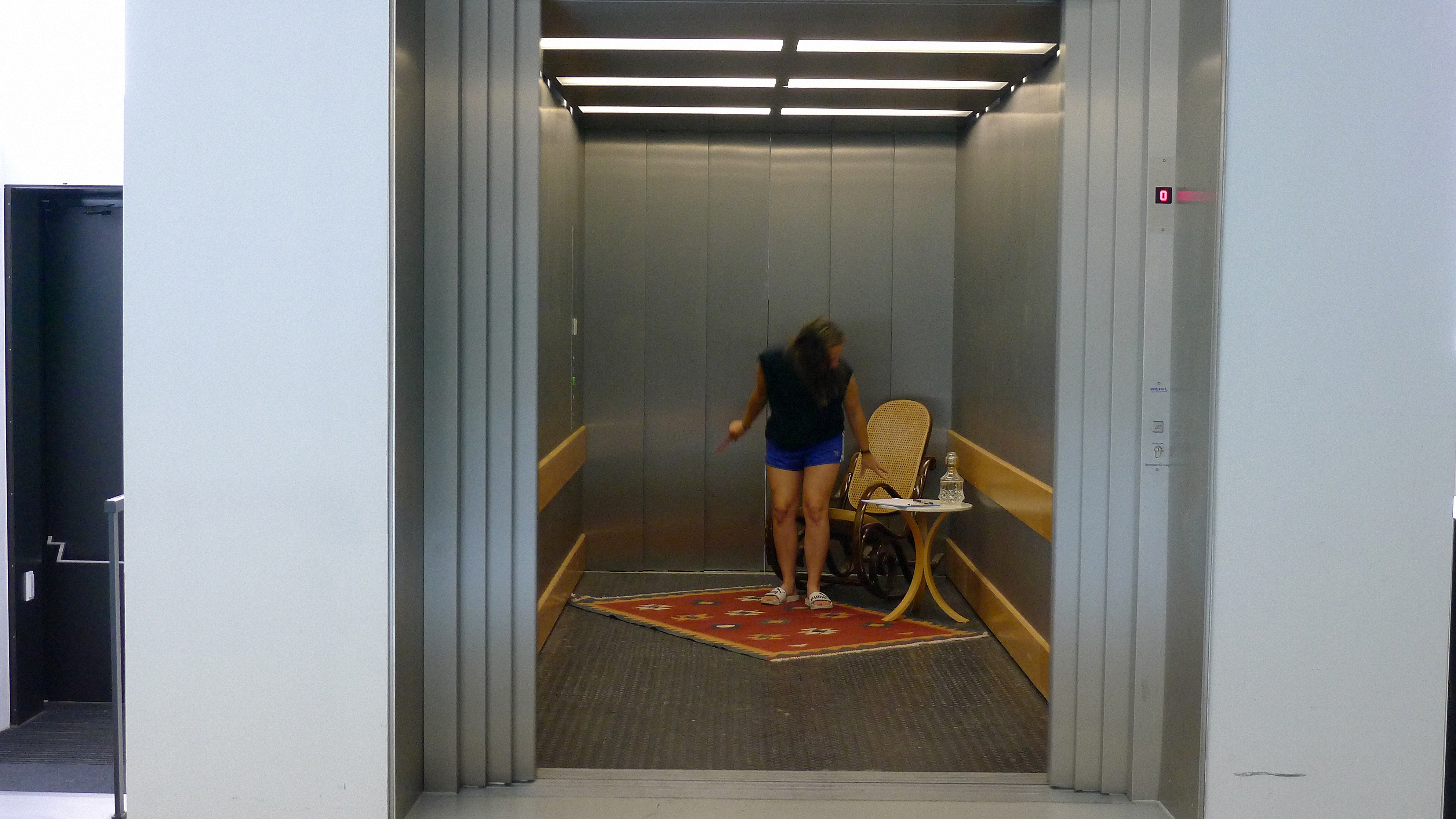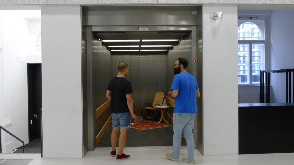 The participants received a card with questions. Following this, they were guided to the second stage, the liminal phase, where they were left alone in an elevator. The participant could sit in a rocking chair on a carpet, meditate and reflect on the questions we have provided them, on a constantly moving ground, in a daily functioning cargo elevator at the university. This setting is a mini metaphor for being “at home in a liminal world”, literally. The participant was invited to take a seat and experience the feeling of not knowing where they were going, and being alone through it, being visible but invisible under the public gaze. The cargo elevator had two doors: the participant entered from inside, the building, and at the end, upon completion of the liminal phase, left from the other door to the courtyard on the opposite side. The start in the courtyard, the elevator and the end in a parking lot – all happened in places we could call “liminal”. They were not guided through the experience. It was the participants’ decision when to leave the place, as long as they enjoyed or could bear to stay on this moving ground. The same person, who had welcomed them at the beginning, waited outside on the other side of a table. At this stage, they sat and talked one-on-one, about their experience of in-betweenness inside the elevator and in their lives in general.