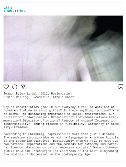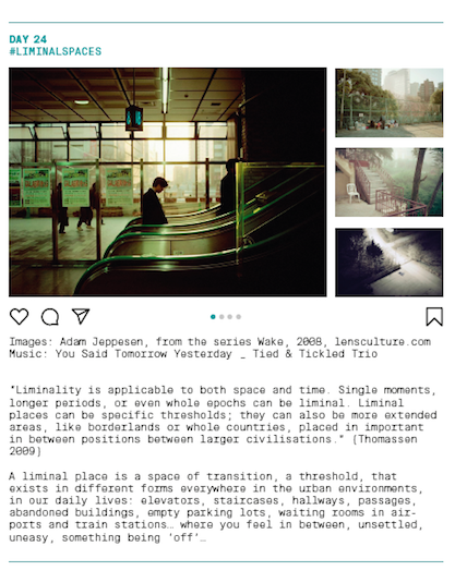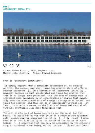 Considering liminality both as a concept and an approach, the project involves artistic and curatorial approaches in three different actions. The first part is a performative act to open space for “liminals”, people who feel in between, to realise and reflect on their own liminality in an elevator as “liminal” setting. The second involves in-depth interviews with people who feel in between homes, jobs and cities. The third is an online exploration of diverse liminality aspects in the Instagram account @athomeinaliminalworld. Displaying personal experiences based on the interviews and the performance, the account provides a ground to share background research with readings, artworks and a music playlist that relates to the feeling of in-betweenness. With all three actions, the project intends to create a ground to transform individual experiences into shared ones, to initiate connections with others who share similar feelings of in-betweenness, to make liminal people and liminal situations visible, to research the constructive potentials of liminality and to initiate a feeling of community by relating it to the uncertainties growing out of the insecurities of modern life.