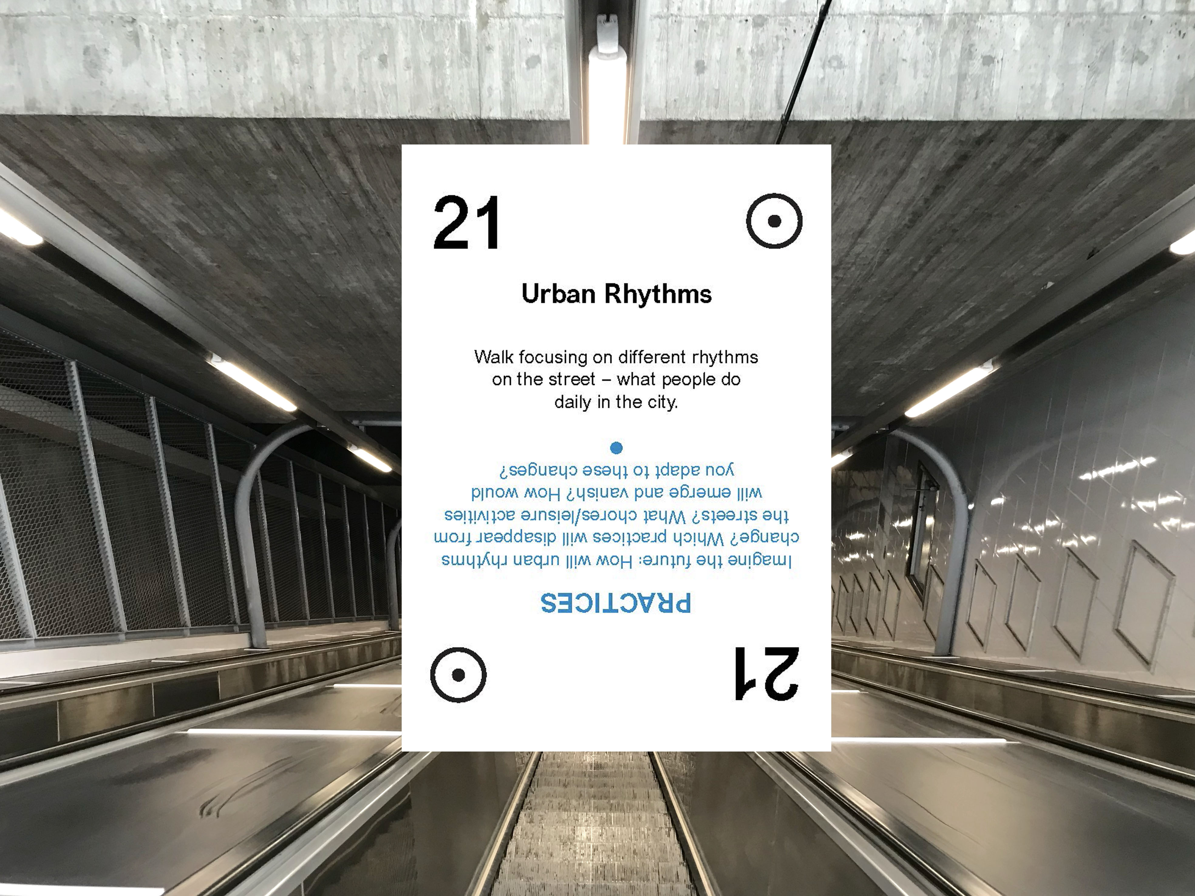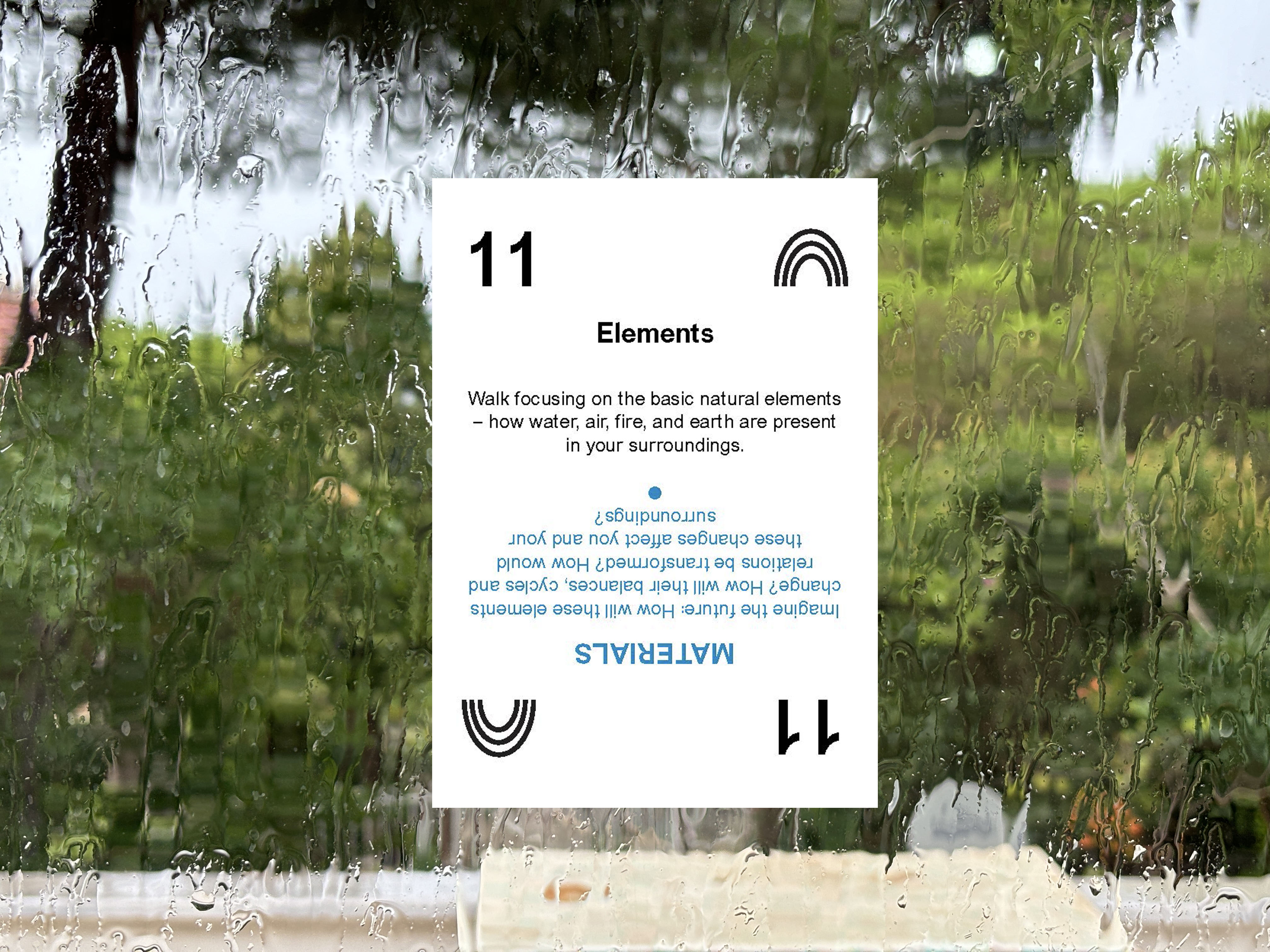 The Shared Walks | Futures card set includes 25 different types of walks shaped around the themes of the BODY, NATURE, MATERIALS, STRUCTURES and PRACTICES. The walkshop methodology has an easily accessible approach based on the simple act of walking realized in three parts: introduction (pairing of participants and selecting walking prompts from the card set), walking unguided in pairs (experiencing, observing and collecting information on an undetermined route) and installation/reflection (installation of outcomes prepared by the participants and/or reflection in a group on the experience and findings from the walks). The final installation/reflection session following the walks opens up a space for sharing embodied experience as well as artefacts and visual, audio-visual, and textual materials gathered on the route. This experimental methodology weighs in both the embodied experience of the participant as a way of initiating awareness and action; and also explores how these collected materials come together, what they indicate about the spaces the participants have walked in and the changing perceptions of futuremaking.